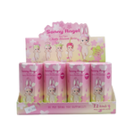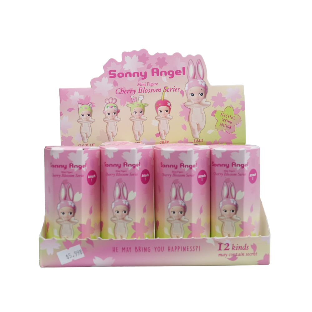 Unit price perThe image displays a retail counter display unit for Sonny Angel Mini Figures from the "Cherry Blossom Series 2017." The display unit is predominantly pink and white, adorned with a delicate cherry blossom petal design, fitting the theme. Several individual blind box-style packages are visible, each cylindrical and primarily pink, also featuring the cherry blossom motif. Each package showcases an illustration of a classic bare-bodied Sonny Angel doll wearing a bunny ear hat, which appears to be a common design element across this particular series.