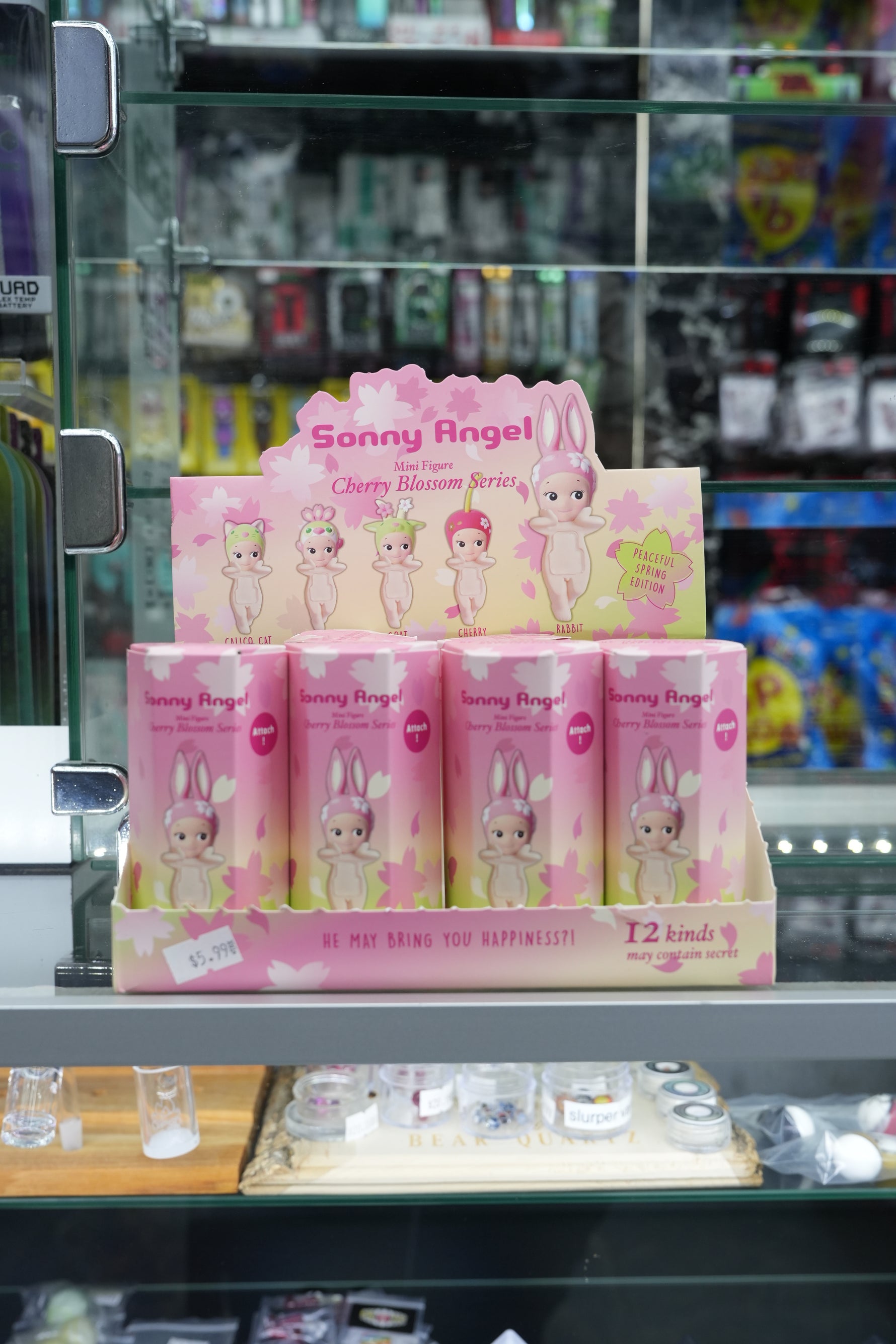 The display unit's header features the "Sonny Angel" logo and the series title "Cherry Blossom Series 2017." It also presents a lineup of different Sonny Angel figures, each with distinct, cherry blossom-inspired headwear or accessories, suggesting a variety of designs to collect. The phrase "Plastic Spring Edition" is also visible. "He may bring you happiness?!" is printed on the front of the display, a common tagline for Sonny Angel products. A number "12 Kinds" is visible, indicating there are 12 different figures in this collection, and it also mentions "May contain Secret," suggesting the possibility of a rare hidden figure. A price tag of "$5.99" is visible on the display unit. These are likely blind boxes, meaning the specific Sonny Angel figure inside each package is a surprise.