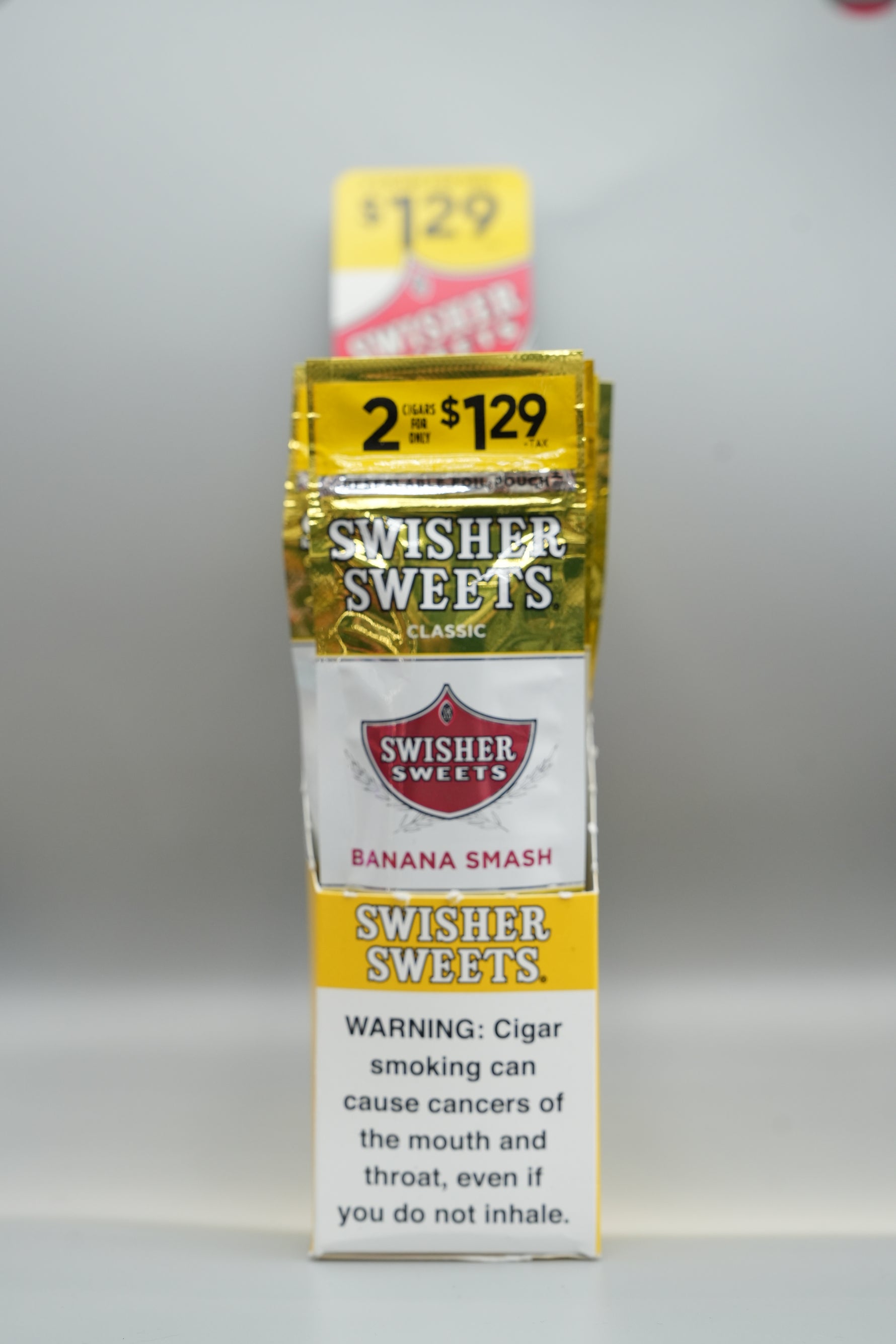 Unit price perThis product is a package of "Swisher Sweets" cigars, specifically mentioning "CLASSIC" and "BANANA SMASH" flavors. The packaging indicates "2 CIGARS FOR ONLY $1.29." There's also a yellow tag above suggesting.