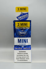 The "SWISHER SWEETS" brand logo is boldly displayed, with "MINI" highlighted to denote the compact size of the cigarillos. The specific flavor is identified as "BLUEBERRY," suggesting a sweet and aromatic fruit-infused profile, a popular choice in the flavored cigarillo market. The "MINI" size offers a convenient option for shorter smoking periods or discreet use.