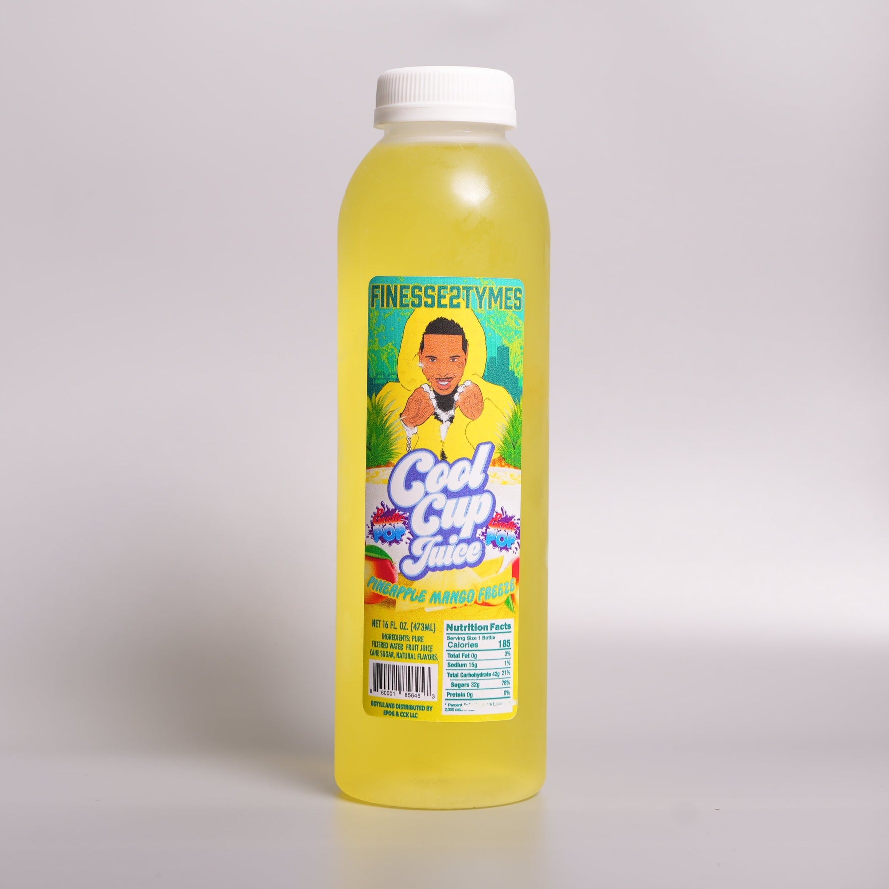 The label is prominently designed with a cartoon or caricature of a smiling man, likely "The Sweet Tymes" figure, wearing a yellow shirt and chain. The brand name "THESWEETTYMES" is at the top of the label. Below the character, the "Cool Cup Juices" logo is displayed in a vibrant, playful font. The flavor is not explicitly stated in a large, clear font, but the yellow color of the juice and the common association with "Cool Cup Juices" suggests a lemonade or a similar fruity, tangy flavor. A "Nutrition Facts" panel is also visible at the bottom of the label. This product likely offers a refreshing, sweet, and tangy drink experience, possibly endorsed by or affiliated with "The Sweet Tymes" brand.
