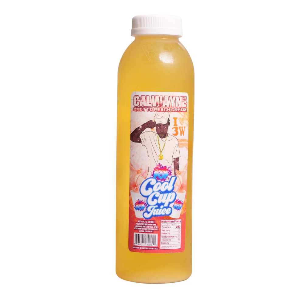 The product is packaged in a clear plastic bottle with a straight, cylindrical body. It has a white, opaque screw-on cap at the top, suggesting a secure and re-sealable closure. The bottle appears to be of a standard size for single-serving beverages, likely holding around 16 to 20 fluid ounces (though without specific dimensions, this is an estimate). Its transparent nature allows the vibrant yellow liquid inside, "Cool Cup Juice," to be clearly visible, which is often a desirable feature for showcasing the beverage's color. The bottle's design seems simple and functional, prioritizing visibility of the product and ease of handling.
