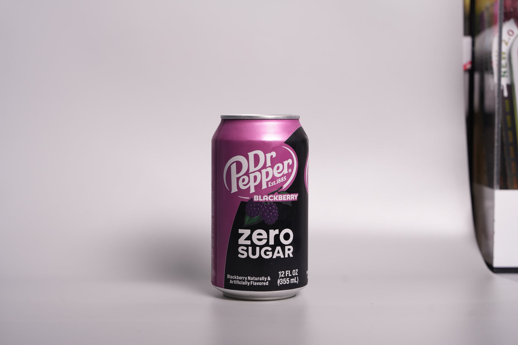 Unit price perThis is a can of Dr. Pepper Blackberry Zero Sugar soda. The can features a two-tone design, with the upper portion in a vibrant fuchsia or magenta color and the lower portion in black. The classic white "Dr. Pepper" logo with "Est. 1885" is prominently displayed. Below the logo, "BLACKBERRY" is clearly indicated, accompanied by an illustration of blackberries. The "ZERO SUGAR" declaration is boldly printed in large white letters on the black section of the can, highlighting its sugar-free nature. The can also states "Blackberry Naturally & Artificially Flavored" and contains "12 FL OZ (355 mL)". This product offers the unique blackberry flavor of Dr. Pepper without added sugar.