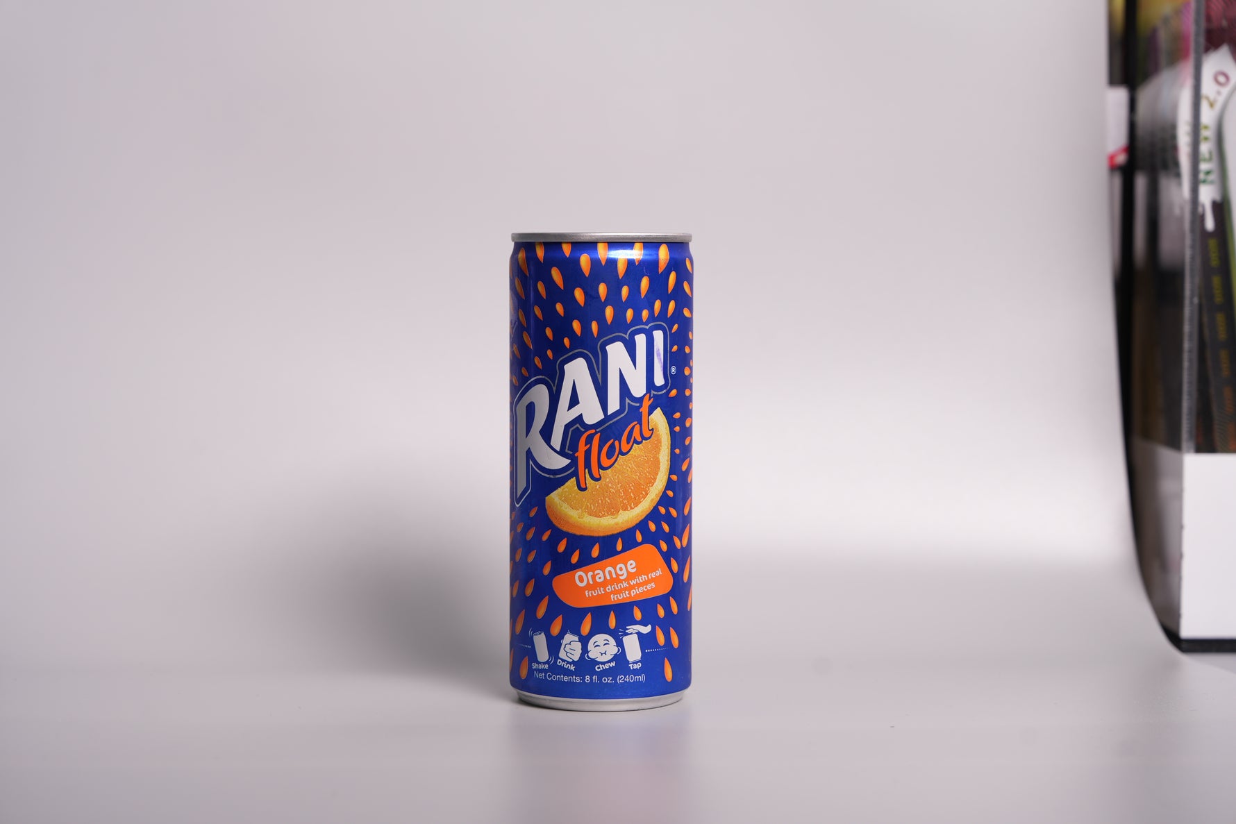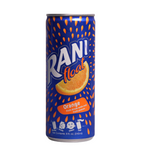 Unit price perThis is a can of Rani Float Orange flavored juice drink. The can features a vibrant dark blue background, decorated with numerous small, orange, tear-drop or splash-like shapes, suggesting the juice's texture. The "RANI float" logo is prominently displayed in white and blue, with "float" appearing in a more fluid, orange script. A large, realistic illustration of an orange slice is positioned beneath the "RANI" logo, clearly indicating the flavor. The can specifies "Orange" and notes "MADE WITH REAL FRUIT PIECES," which is a signature characteristic of Rani Float products. It also states "Net Contents: 8 fl. oz. (240ml)". The overall design highlights the authentic fruit experience with actual fruit pieces in the drink.