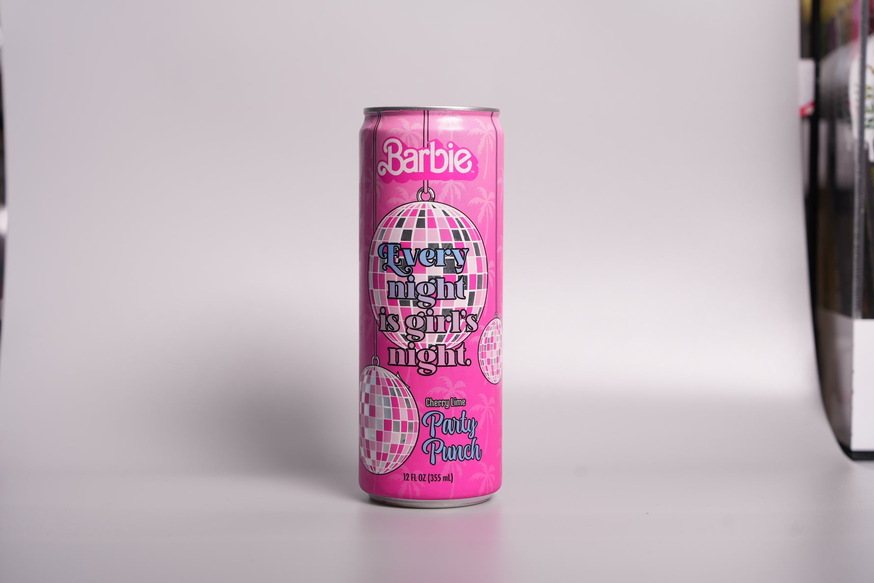 This is a Barbie-themed "Party Punch" beverage can, specifically "Strawberry Lime" flavored. The can is vibrantly pink, adorned with multiple disco ball illustrations, reinforcing its party theme. The iconic "Barbie" logo is prominently displayed at the top in its signature pink script. A central disco ball contains the phrase "Every night is girls night," written in a playful, stylized font. Below this, the flavor "Strawberry Lime" is indicated, followed by "Party Punch." The can also states "12 FL OZ (355 mL)". The overall design, with its bright colors, disco balls, and empowering slogan, is clearly aimed at fans of the Barbie brand and suggests a fun, sweet, and celebratory drink experience.