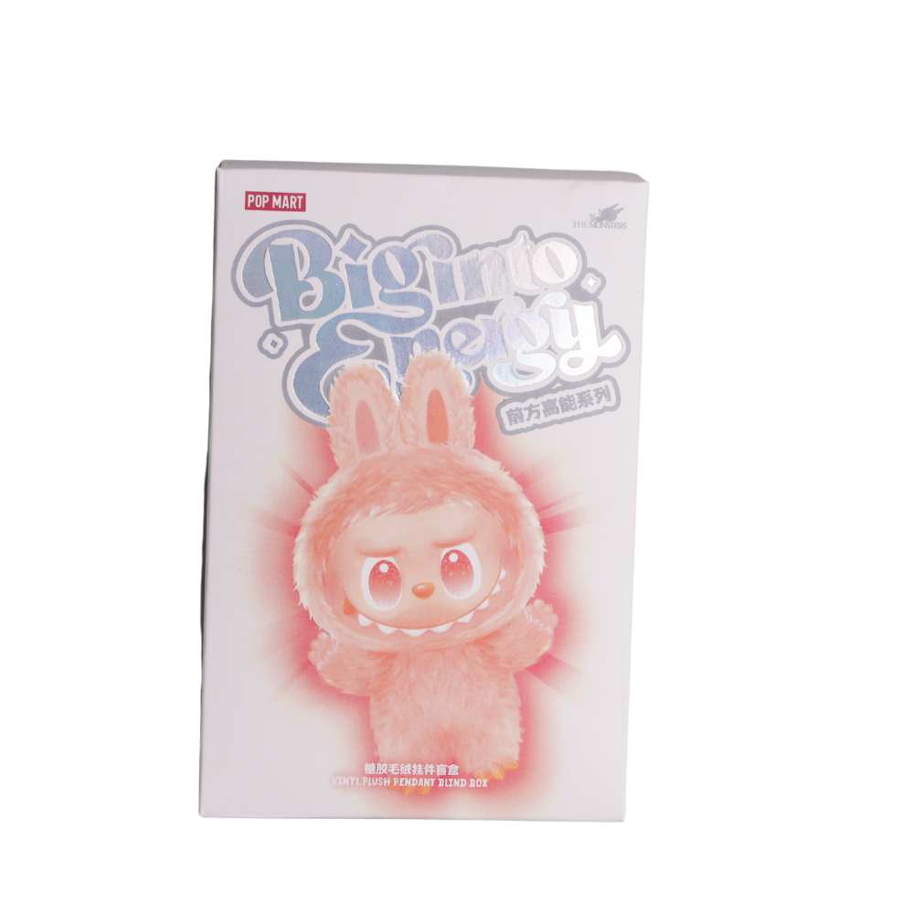 Unit price perThis is a Pop Mart "Biginto Energy" blind box figure, featuring a fluffy, pink, rabbit-like character with a slightly mischievous or energetic expression. The character is depicted with a glowing aura, suggesting its "energy" theme. The box itself is predominantly white with blue and pink accents, prominently displaying the "Pop Mart" logo and the series title "Biginto Energy" in a stylized font. There are also some Chinese characters on the box, likely indicating official licensing or a special edition. This product is likely a collectible toy, sold in a "blind box" format where the specific figure inside is a surprise until opened.