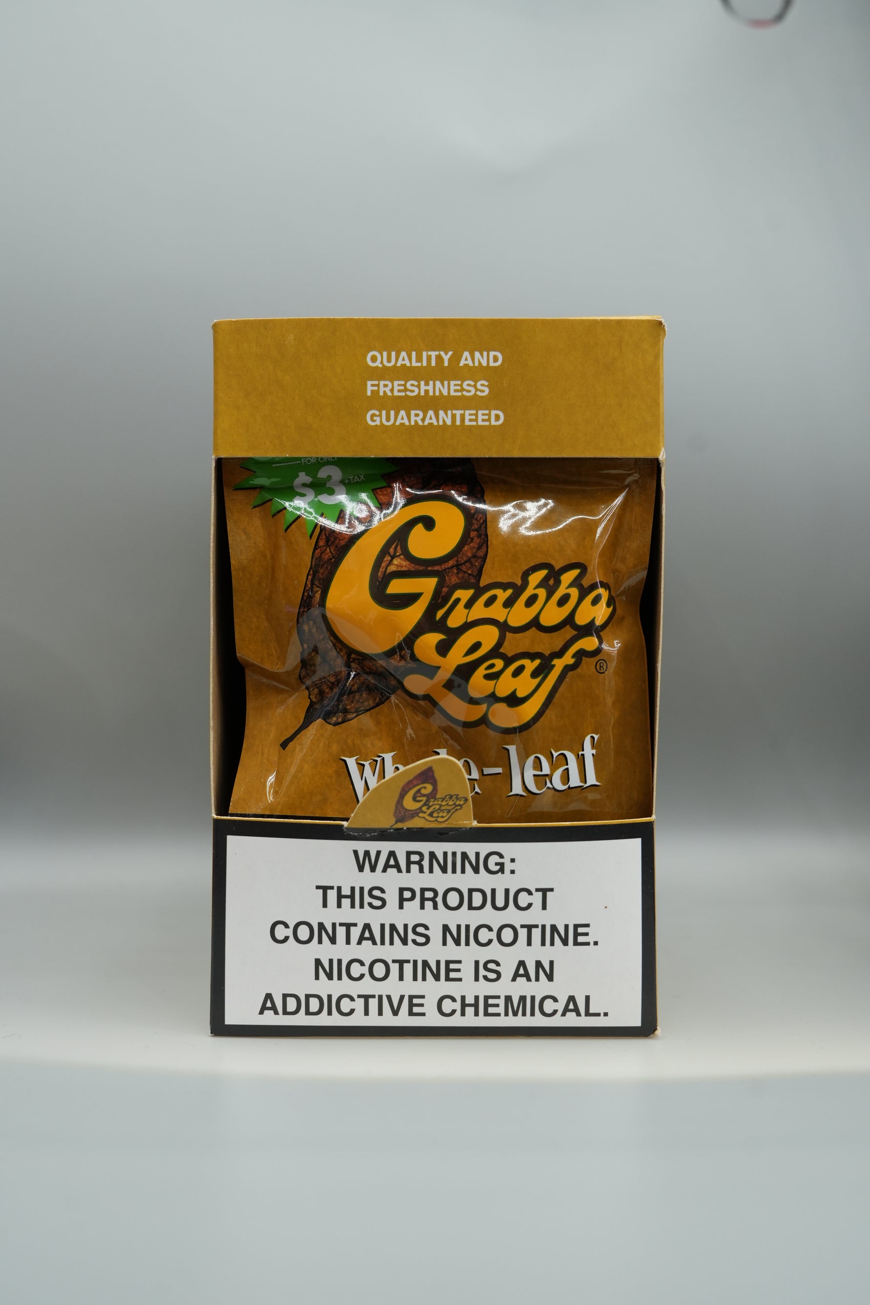 This product is a package of "Grabba Leaf" tobacco wraps. The top of the packaging states "QUALITY AND FRESHNESS GUARANTEED." Below the brand name, it appears to say "Whole-leaf.