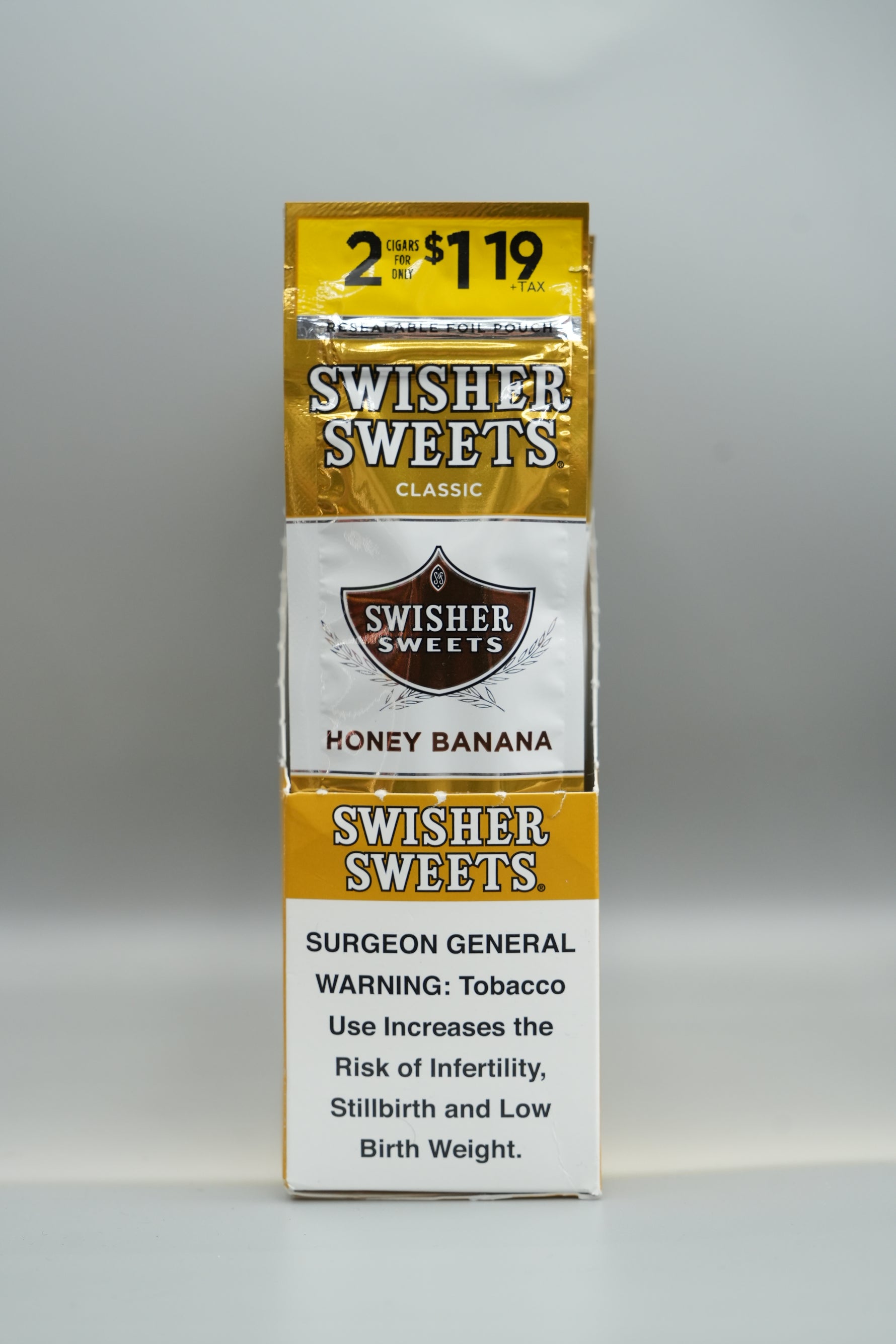 The top section of the package contains two individual "RESEALABLE FOIL POUCHES," a crucial feature designed to maintain the freshness and quality of the cigarillos. The "SWISHER SWEETS" brand logo is clearly displayed, along with "CLASSIC" and "HONEY BANANA" descriptors. The "HONEY BANANA" variant suggests a unique and appealing blend of sweet honey and tropical banana flavors, offering a distinctive and aromatic smoking experience.