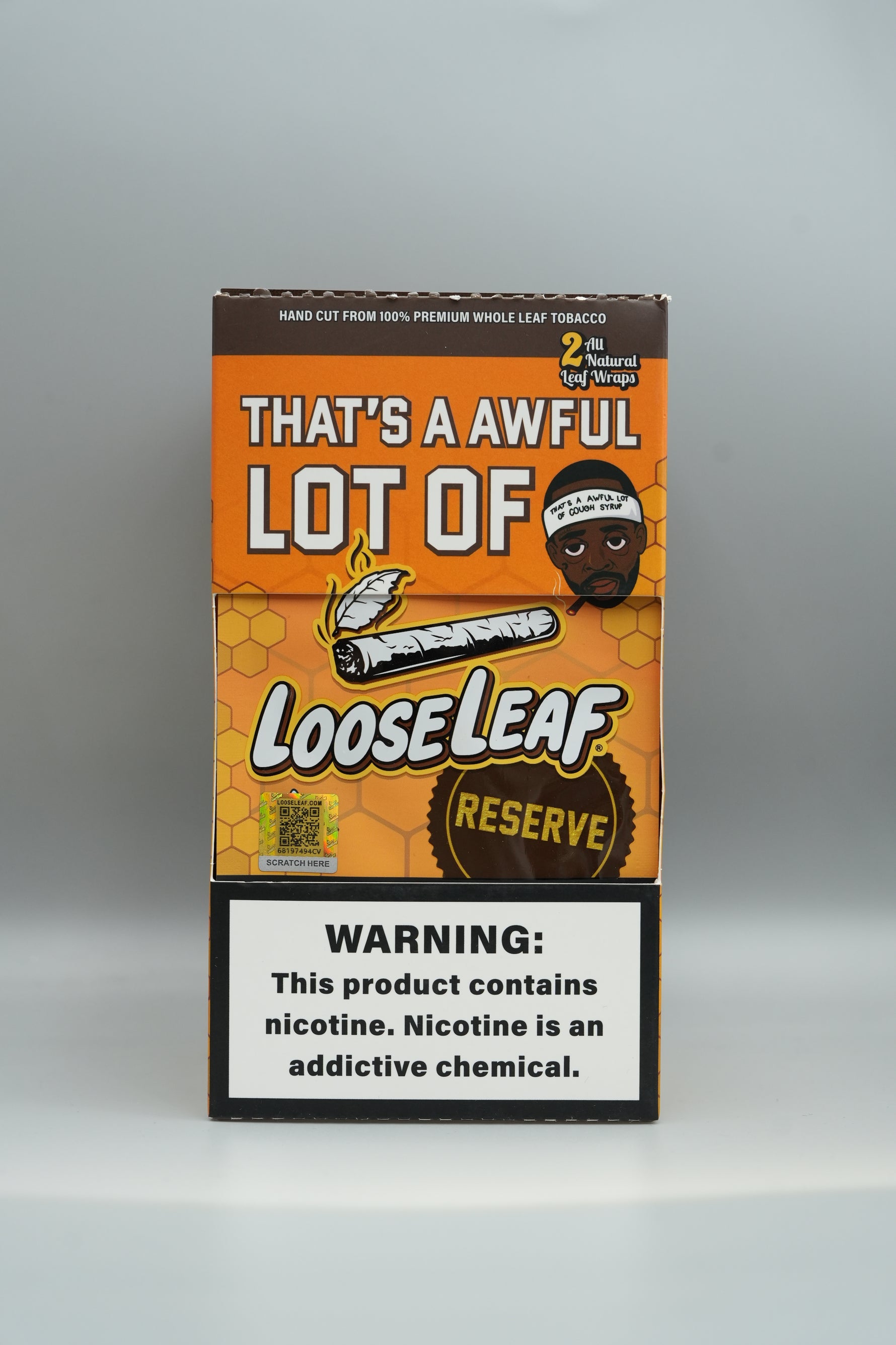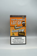 The image displays a retail box of "LOOSE LEAF RESERVE" brand wraps, featuring a distinctive and humorous packaging design. The box is predominantly orange and black, giving it a bold appearance.